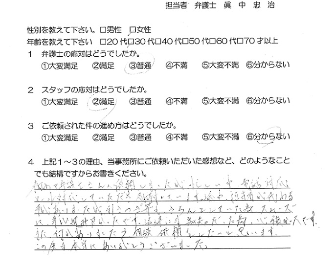 お客様の声(ご相談者の声、評判・口コミ)21 公開日:2015/07/06 お客様の声 初めて弁護士さんへ依頼しましたが、忙しい中、電話対応、メール対応していただき感謝しています。担当者が代わる事がありましたが、引きつぎ等もきちんとしていた為、スムーズに事が進み良かったです。法律には無知だった為、心強かったです。また何かありましたら、相談、依頼をしたいと思います。 この度は本当にありがとうございました。 1 弁護士の対応はどうでしたか:普通 2 スタッフの対応はどうでしたか:満足 3 ご依頼された件の進め方はどうでしたか:分からない 「お客様の声(ご相談者の声、評判・口コミ)22」 「お客様の声(ご相談者の声、評判・口コミ)20」