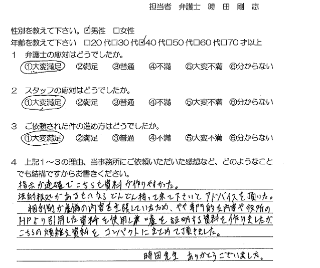 お客様の声(ご依頼者の声)口コミ・評判 公開日:2023/04/18 お客様の声 指示が的確でこちらも資料が作りやすかった。 法的根拠があるものならどんどん持って来て下さいとアドバイスを頂いた。 相手側が虚偽の内容を主張していたため、やや専門的な内容や役所のHPより引用した資料を使用し嘘を証明する資料を作りましたが、こちらの煩雑な資料をコンパクトにまとめて頂きました。 時田先生 ありがとうございました。 1 弁護士の対応はどうでしたか:大変満足 2 スタッフの対応はどうでしたか:大変満足 3 ご依頼された件の進め方はどうでしたか:大変満足 「お客様の声(ご相談者の声)口コミ・評判」 「お客様の声(ご相談者の声)口コミ・評判」