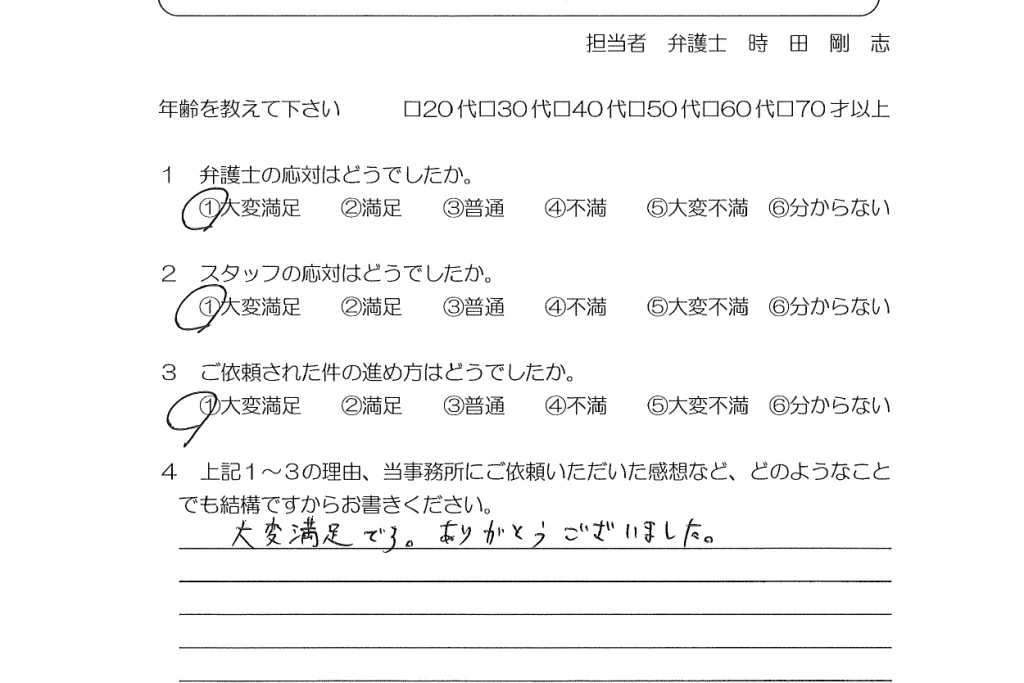 お客様の声(ご依頼者の声)評判・口コミ 公開日:2026/04/22 お客様の声 ■年代 — ■担当弁護士 時田剛志 ■弁護士の応対 大変満足 ■スタッフの応対 大変満足 ■案件の進め方 大変満足 大変満足です。ありがとうございました。 関連記事: お客様の声(ご相談者の声、評判・口コミ)38 お客様の声(ご依頼者の声)口コミ・評判 お客様の声(ご相談者の声)口コミ・評判 お客様の声(ご依頼者の声)評判・口コミ 「お客様の声(ご相談者の声)評判・口コミ」