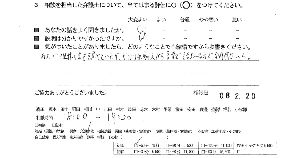 お客様の声(ご相談者の声)評判・口コミ 公開日:2026/03/17 お客様の声 ■担当弁護士 遠藤 吏恭 ■あなたの話をよく聞きましたか 大変よい ■説明はわかりやすかったですか 大変よい AIで法律の事を調べていたが、やはり生身の人から言葉で話される方が、納得がいく。 関連記事: お客様の声(ご相談者の声、評判・口コミ)20 お客様の声(ご相談者の声、評判・口コミ)55 お客様の声(ご相談者の声、評判・口コミ)66 お客様の声(依頼者の声、評判・口コミ) 「お客様の声(ご依頼者の声)評判・口コミ」