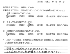 弁護士に依頼することが初めてでしたが、とてもわかりやすく野田弁護士には感謝しております。